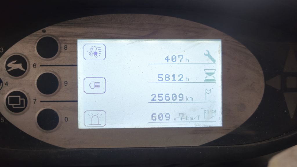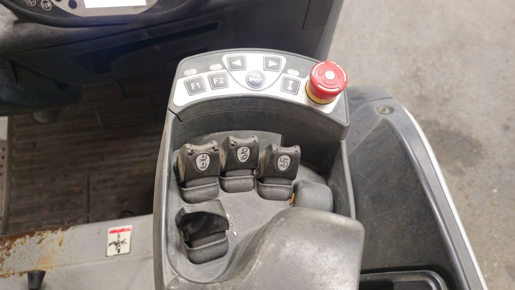 Mast: Triplex Hubhöhe: 4524 mm Bauhöhe: 2085 mm Freihub: 1614 mm Gabellänge: 1100 mm |